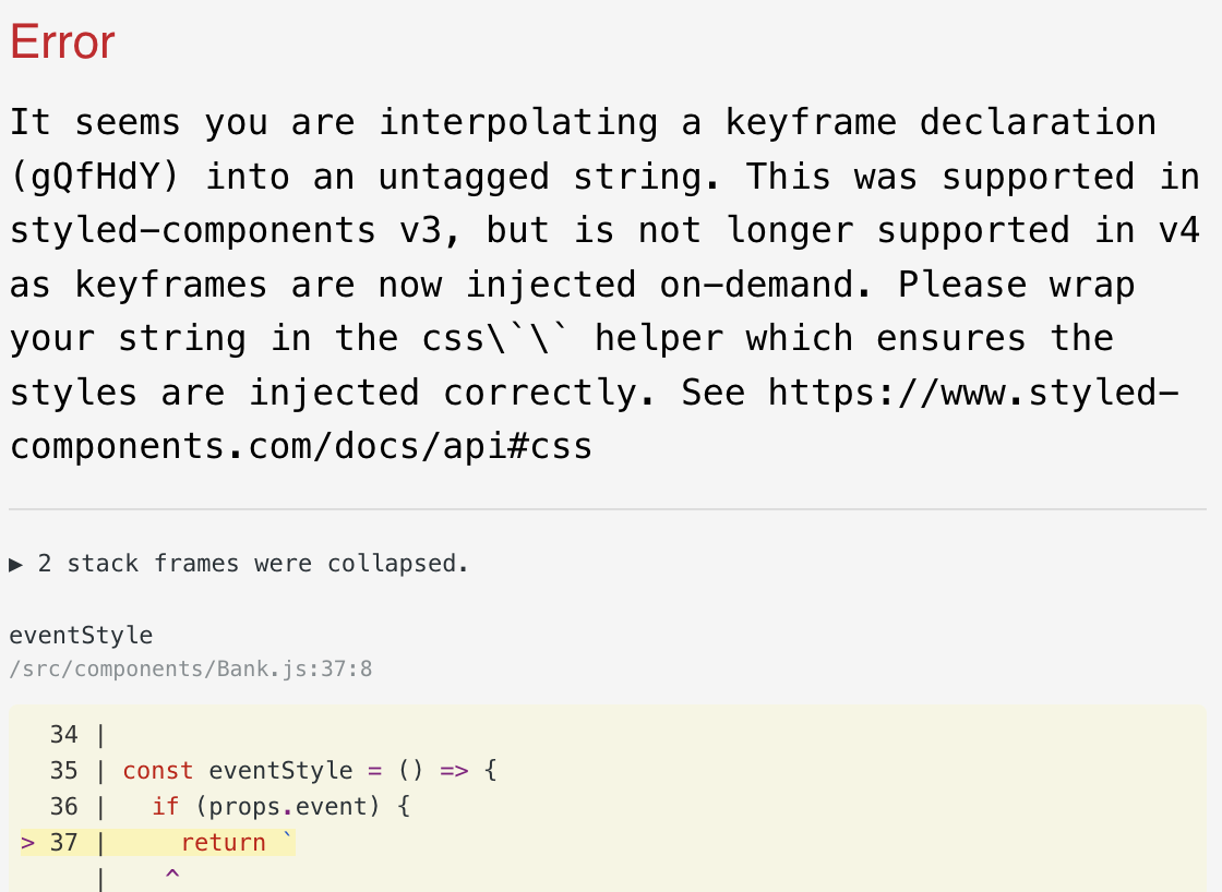 const eventStyle = () => { if (props.event) { return css` grid-column: 1 / 4; order: -1; animation: ${onEventAnimation(color)} 3s infinite; `; } };이때 단순 템플릿 리터럴로 리턴