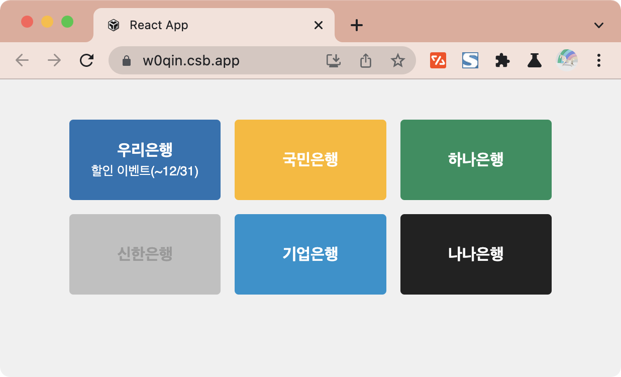 /* App.js */ import Bank from './components/Bank'; import styled from 'styled-components'; const AppBlock = styled.div` display: grid; grid-template-columns: 1fr 1fr 1fr; width: 100%; min-width: 32rem; max-width: 48rem; margin: 4rem auto; column-gap: 1.4rem; row-gap: 1.4rem; `; function App() { return ( <AppBlock> <Bank name="wr" event> 우리은행 <br /> <span>할인 이벤트(~12/31)</span> </Bank> <Bank name="kb">국민은행</Bank> <Bank name="hn">하나은행</Bank> <Bank name="sh" disabled> 신한은행 </Bank> <Bank name="ibk">기업은행</Bank> <Bank name="nn">나나은행</Bank> </AppBlock> ); } export default App;