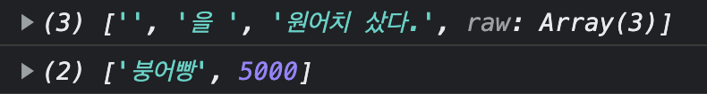 함수``형태로 쓸 경우 첫 번째 인수는 표현식을 기준으로 분할된 문자열의 배열이, 나머지 인수는 표현식으로 전달된 값이 됩니다.let name = '붕어빵'; let value = 5000; const tag = (a, ...b) => { console.log(a); console.log(b); } tag`${name}을 ${value}원어치 샀다.`;
