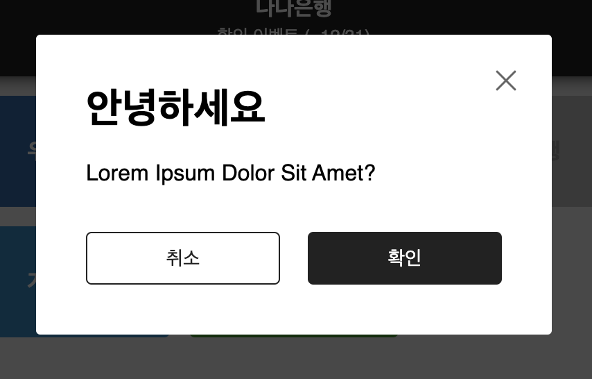 /* App.js */ //... function App() { const bankList = [ { eng: 'wr', ko: '우리' }, { eng: 'kb', ko: '국민' }, { eng: 'hn', ko: '하나', event: { name: '추첨', date: '1/31' } }, { eng: 'sh', ko: '신한', disabled: true }, { eng: 'ibk', ko: '기업', event: { name: '한정', date: '1/31' } }, { eng: 'nh', ko: '농협' }, { eng: 'na', ko: '나나' } ]; const [popup, setPopup] = useState(false); const onClick = () => { console.log('onclick'); setPopup(true); }; const onConfirm = () => { console.log('확인'); setPopup(false); }; const onCancel = () => { console.log('취소'); setPopup(false); }; return ( <> <AppBlock> {bankList.map((bank) => { return ( <Bank id={bank.eng} key={bank.eng} name={bank.eng} disabled={bank.disabled} event={bank.event} onClick={onClick} > <span>{bank.ko}은행</span> {bank.event && ( <i> {bank.event.name} 이벤트 (~{bank.event.date}) </i> )} </Bank> ); })} </AppBlock> <LayerPopup visible={popup} onCancel={onCancel} onConfirm={onConfirm} /> </> ); } export default App;한편, 심적 안정을 위한(?) 팝업 트랜지션 효과도 넣어줍니다.