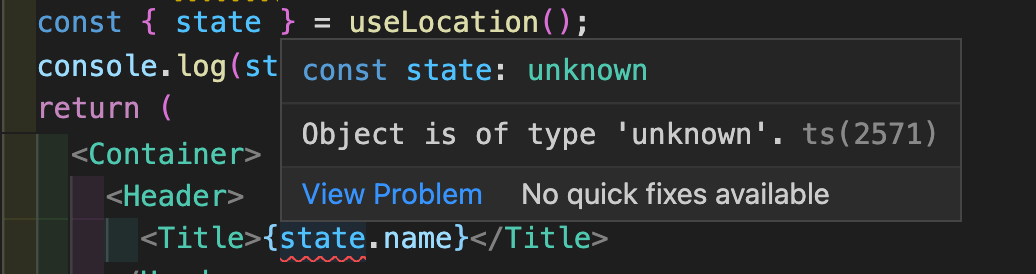 console.log(useLocation()); 하지만 이대로 state를 가져다 쓰려면 타입을 알려달란 잔소리를 듣습니다.
