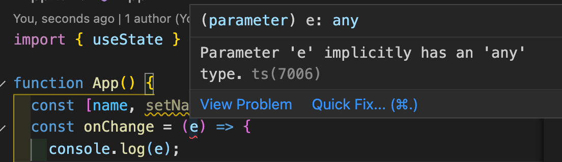잠깐, 이 넘겨받을 e는 타입이 뭐지!? 하고 타입스크립트가 의문을 제기합니다.