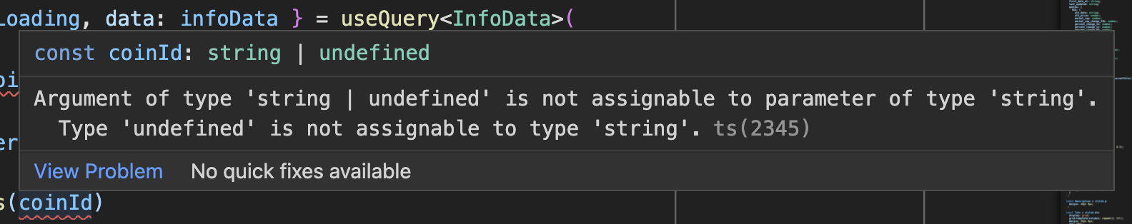 const { isLoading: infoLoading, data: infoData } = useQuery<InfoData>( ['info', coinId], () => fetchCoinInfo(coinId) ); const { isLoading: tickersLoading, data: tickersData } = useQuery<PriceData>( ['tickers', coinId], () => fetchCoinTickers(coinId) );앗, 그런데 음? “타입이 string | undefined인 녀석을 string 타입의 파라미터로 지정하려 들다니!”하고 시비... 아니, 지적을 하네요.