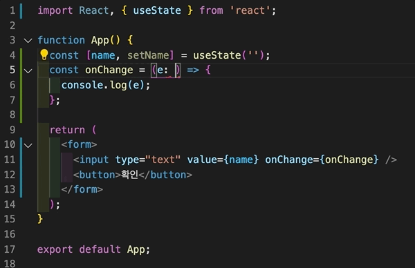 import { useState } from 'react'; function App() { const [name, setName] = useState(''); const onChange = () => {}; return ( <form> <input type="text" value={name} onChange={onChange} /> <button>확인</button> </form> ); } export default App;이제 입력한 내용을 받아오기 위해 event 객체를 인자로 받아올 건데...