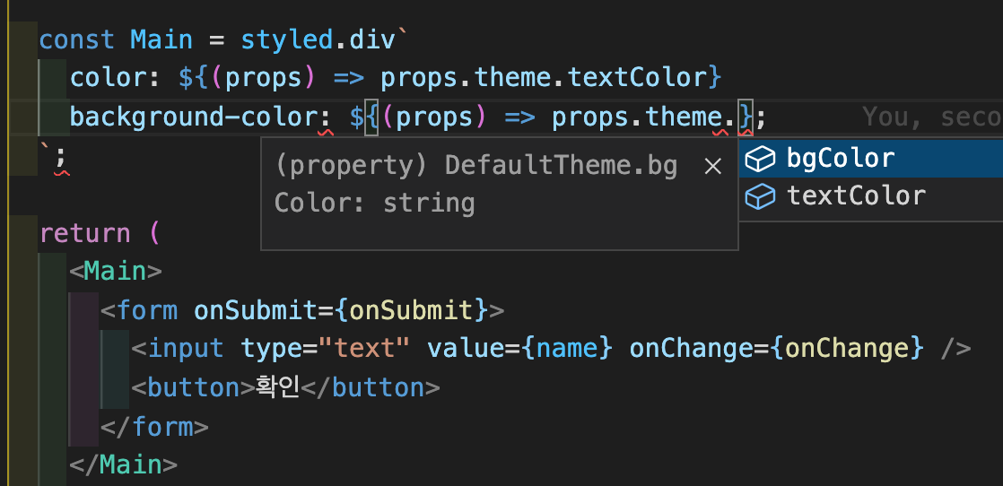 /* index.tsx */ //... import { ThemeProvider } from 'styled-components'; import { darkTheme } from './theme'; ReactDOM.render( <React.StrictMode> <ThemeProvider theme={darkTheme}> <App /> </ThemeProvider> </React.StrictMode>, document.getElementById('root') );그러면 props.theme로 가져올 수 있게 되며, 어떤 속성을 어떤 타입으로 써야하는지 명확히 알 수 있습니다.