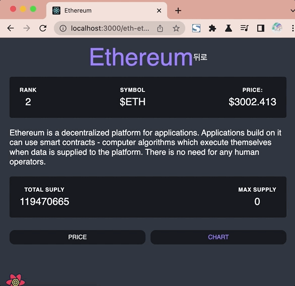 <CoinItem key={coin.id}> <Link to={`/${coin.id}`}> <Img src={`https://cryptoicon-api.vercel.app/api/icon/${coin.symbol.toLowerCase()}`}/> {coin.name} </Link> </CoinItem>이제 상세화면인 <Coin/>를 작업할 차례입니다.