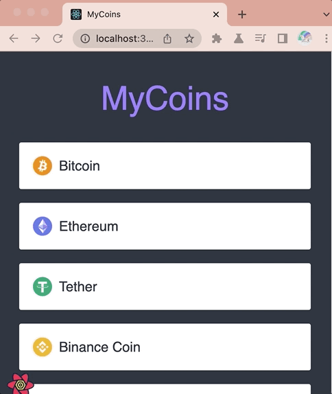function Coins() { const [coins, setCoins] = useState<ICoin[]>([]); const [loading, setLoading] = useState(true); useEffect(() => { (async () => { const response = await fetch('https://api.coinpaprika.com/v1/coins'); const json = await response.json(); setCoins(json.slice(0, 30)); setLoading(false); })(); }, []); return ( <Container> <Header> <Title>MyCoin</Title> </Header> {loading ? ( <Loader>Loading...</Loader> ) : ( <CoinList> {coins.map((coin, i) => ( <CoinItem key={coin.id}> <Link to={`/${coin.id}`}>{coin.name}</Link> </CoinItem> ))} </CoinList> )} </Container> ); }글만 있으면 심심하니 이미지도 넣어줍니다.