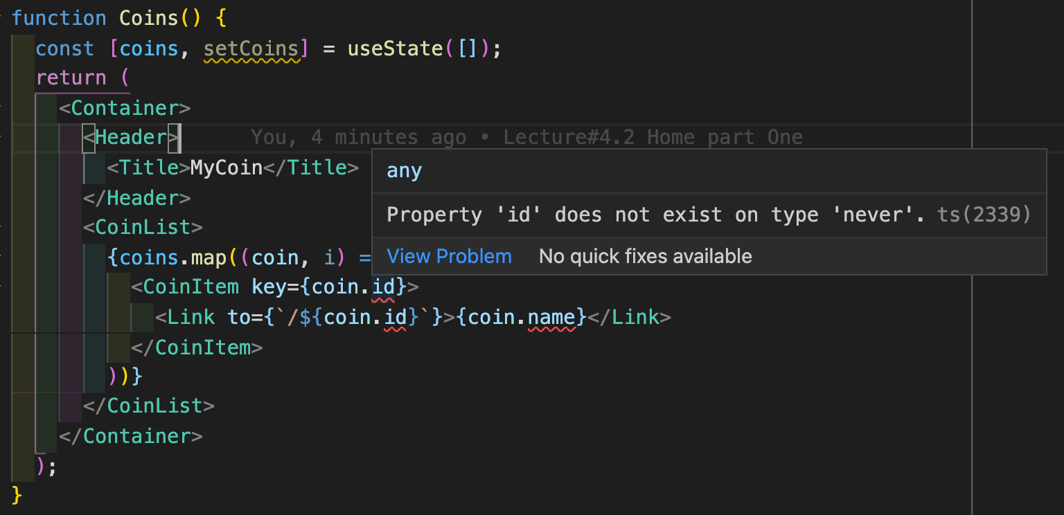 const [info, setInfo] = useState({}); const [priceInfo, setPriceInfo] = useState({}); useEffect(() => { (async () => { const infoData = await ( await fetch(`https://api.coinpaprika.com/v1/coins/${coinId}`) ).json(); const priceData = await ( await fetch(`https://api.coinpaprika.com/v1/tickers/${coinId}`) ).json(); setInfo(infoData); setPriceInfo(priceData); setLoading(false); })(); }, [coinId]); // coinId는 URL을 통해 넘어오므로 변경될 일이 없어 어차피 1번만 실행됨그럼 다음에 할 일은... 깐깐한 검수 통과를 위한 타입 지정이죠!