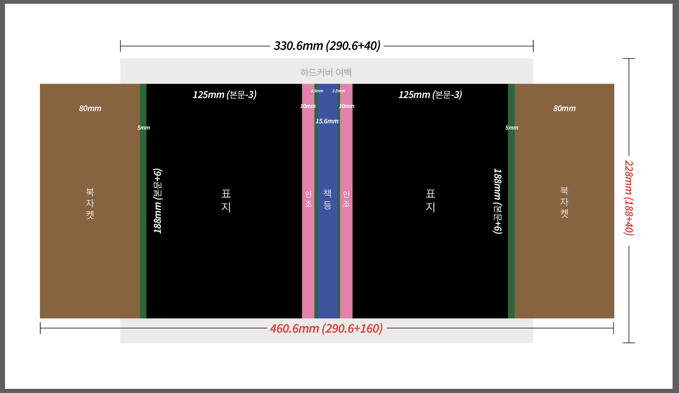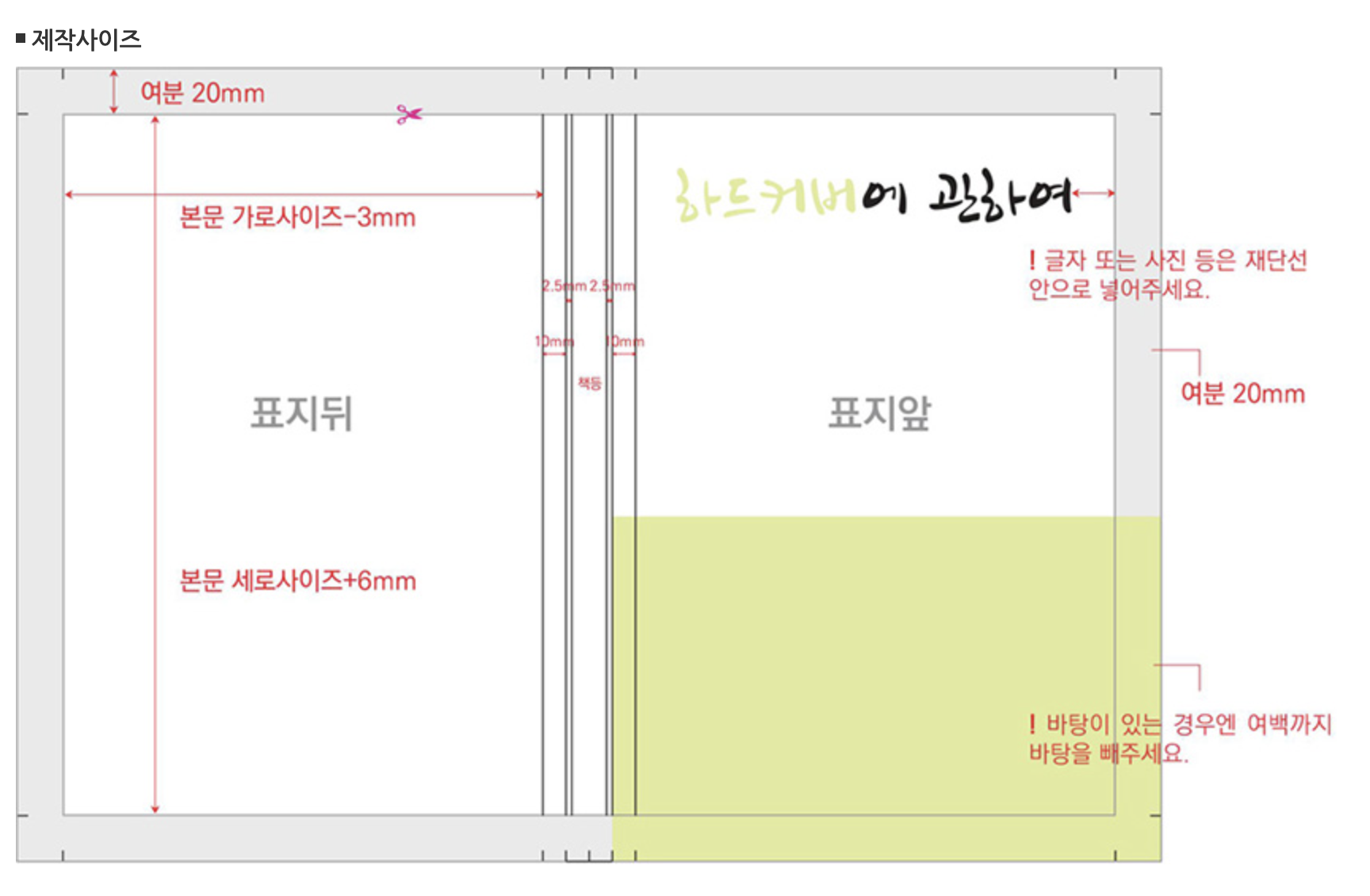 특히, 하드커버의 표지는 접어서 붙이는 방식이기 때문에 표지의 여백이 더 커야 해요. (여분 20mm)