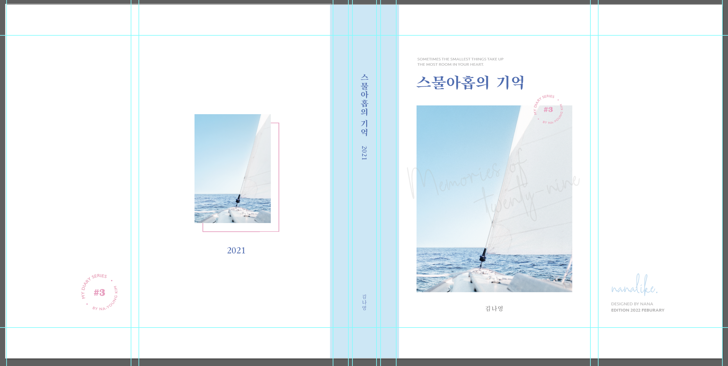 앞면, 뒷면, 책등, 책날개, 여백 등 모두 이어지는 부분이기 때문에 넓은 캔버스에서 작업한다고 생각해야 합니다.