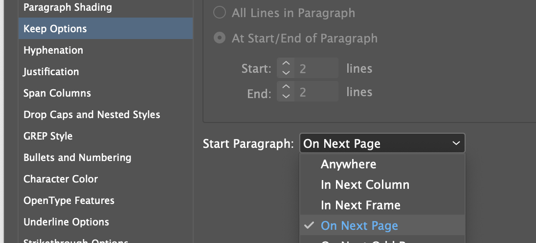 - Keep Options에서 Start Paragraph를 Next Page나 Next Odd Page로 설정하면 해당 서식이 적용된 단락은 무조건 새 페이지(새 홀수 페이지)에서 시작