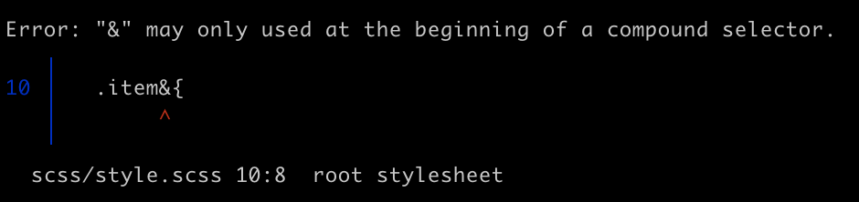 Error: "&" may only used at the beginning of a compound selector 또, @media 같은 at-rules 가 중첩되어 있으면 스타일 규칙이 그 안에 있도록 바꿔주기 때문에 쉽게 조건을 추가할 수 있어요.