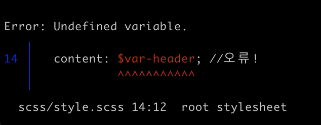 .header { $var-header: '이 변수는 .header 내에서만 쓸 수 있어요!'; } .body { content: $var-header; //오류! }