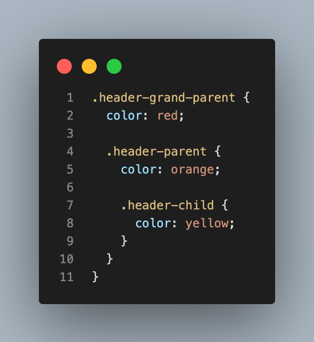 어떻게 사용해야 할지 감이 오실 텐데, 중첩하고 싶은 만큼 대괄호{} 안에 자식 셀렉터를 넣으면 됩니다.