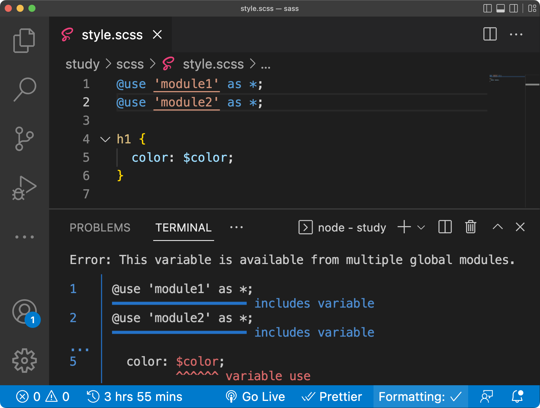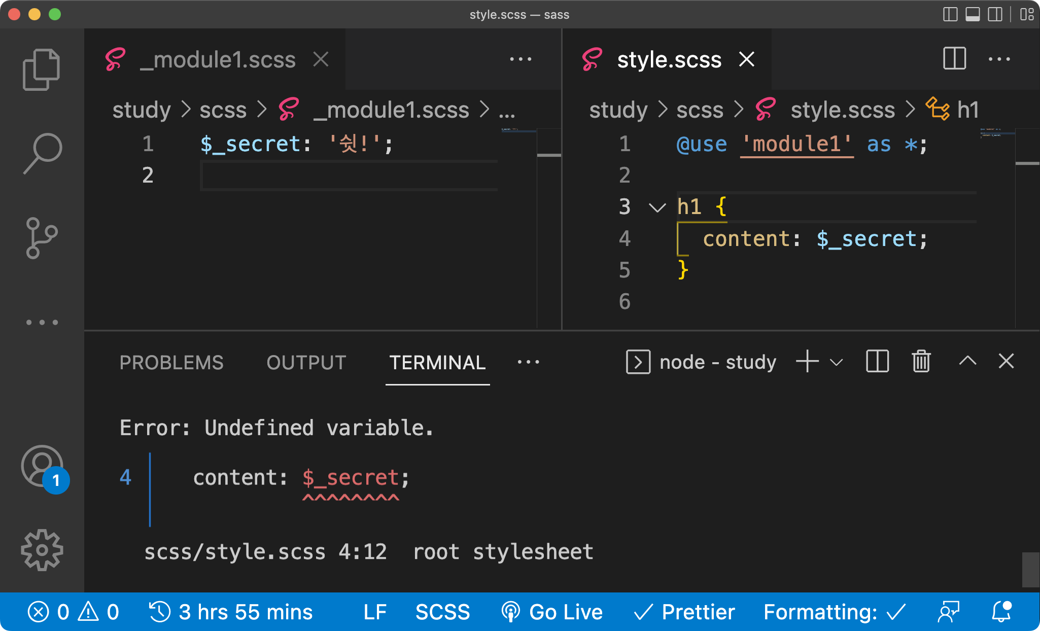 대신 @import와 다르게 @use는 덮어씌우지 않고 컴파일 단계에서 알려줍니다. 친절쓰! 👼