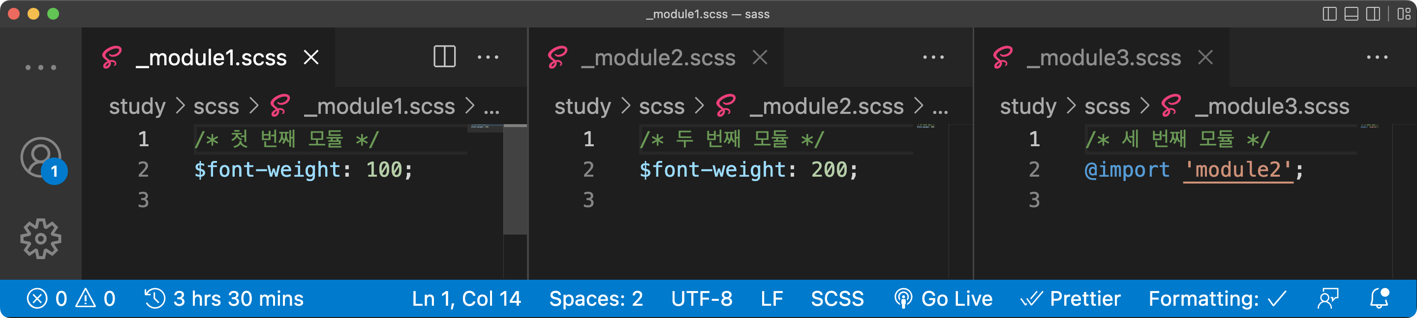 // style.scss @import 'module1'; @import 'module2'; @import 'module3'; h1 { font-weight: $font-weight; }세 개의 스타일시트를 불러와 사용하는 style.scss 파일입니다.