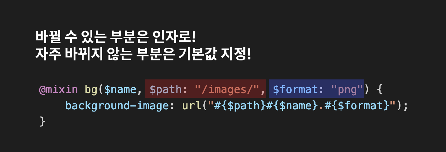 @mixin bg($name, $path: "/images/", $format: "png") { background-image: url("#{$path}#{$name}.#{$format}"); } .logo { @include bg('logo'); } .arrow { @include bg('arrow'); } .photo { @include bg('photo', $format:'jpg'); }반복되는 부분을 확 줄이고 인자만으로 배경 이미지를 쉽게 넣을 수 있게 됐습니다! 🙌