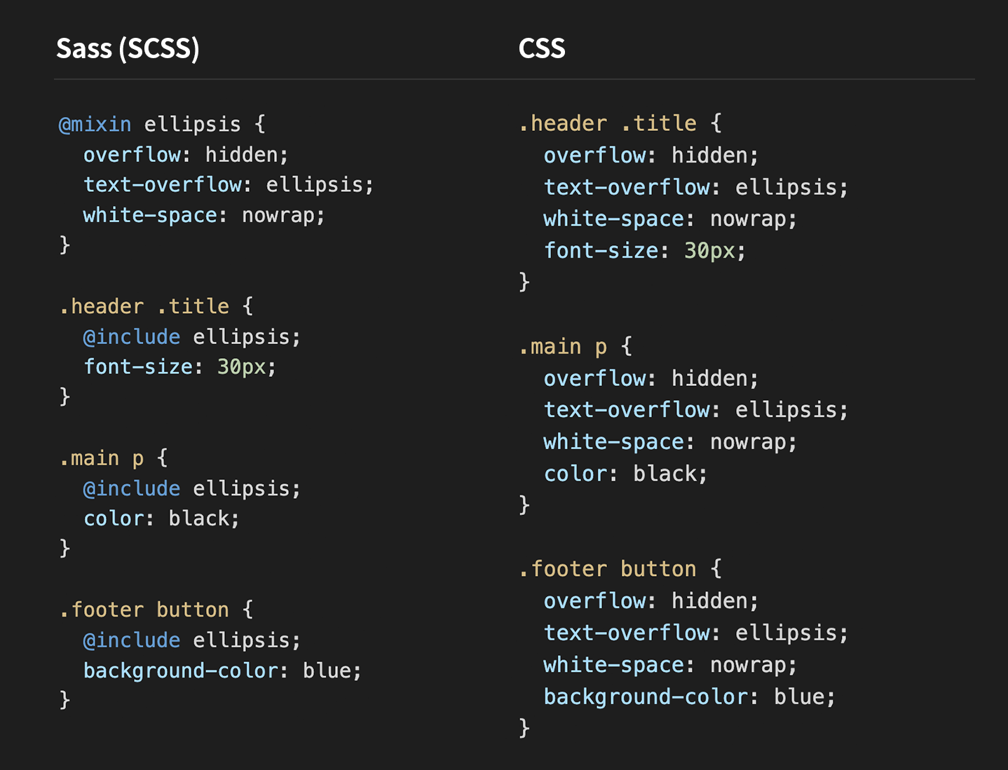 // 1) 믹스인을 만들고... @mixin hover { &:hover { font-weight: bold; @content; } &.on { @content; } } button { // 2) 불러와 쓸 때 내용을 입력합니다. @include hover { color: red; } } /* * 출력결과: button:hover { font-weight: bold; color: red; } button.on { color: red; } */저는 자주 쓰는 미디어쿼리 분기문을 믹스인으로 만들어 놓고, 다른 곳에서 불러와 쓰는 용도로 사용합니다.
