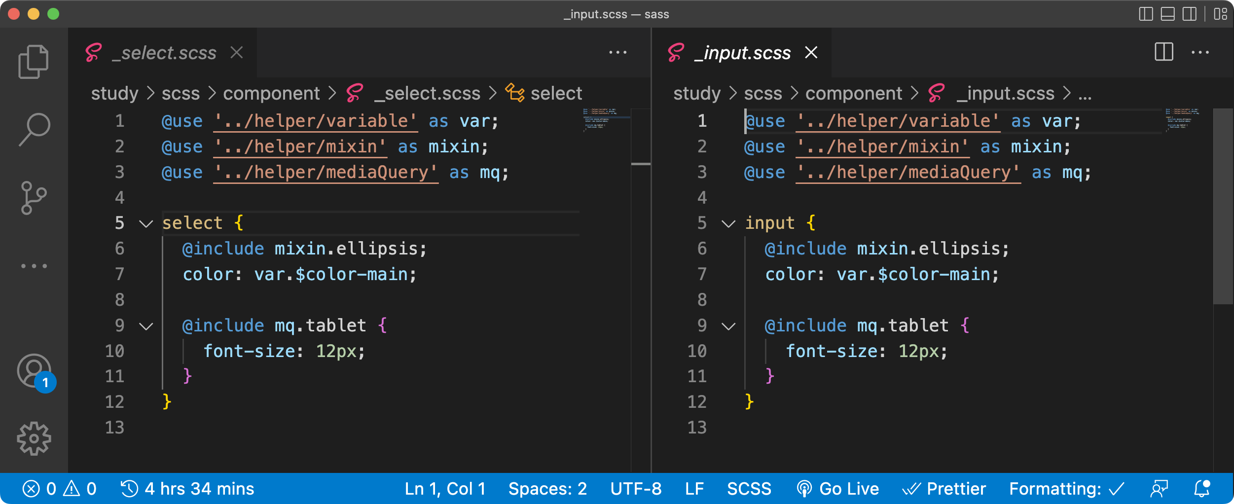 @use <불러올 scss 파일>로 작성합니다.차이점이 있다면 멤버를 사용할 때 네임스페이스를 지정해 줘야 한다는 것!