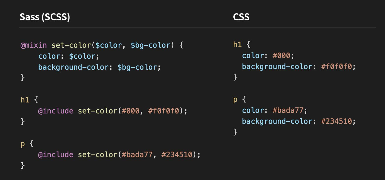 @mixin set-color($color, $bg-color) { color: $color; background-color: $bg-color; } h1 { @include set-color(#000, #f0f0f0); } p { @include set-color(#bada77, #234510); }