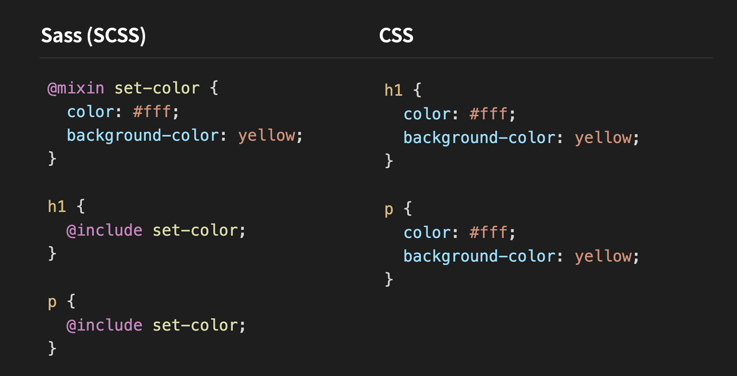 @mixin set-color { color: #fff; background-color: yellow; } h1 { @include set-color } p { @include set-color }