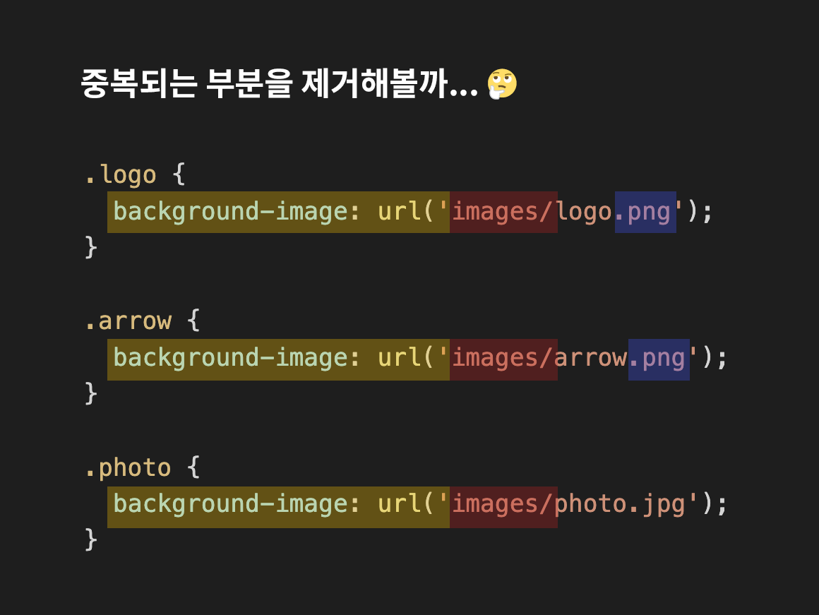 .logo { background-image: url('images/logo.png'); } .arrow { background-image: url('images/arrow.png'); } .photo { background-image: url('images/photo.jpg'); }우리가 Sass를 쓰는 이유는? 귀찮으니까요 🤤