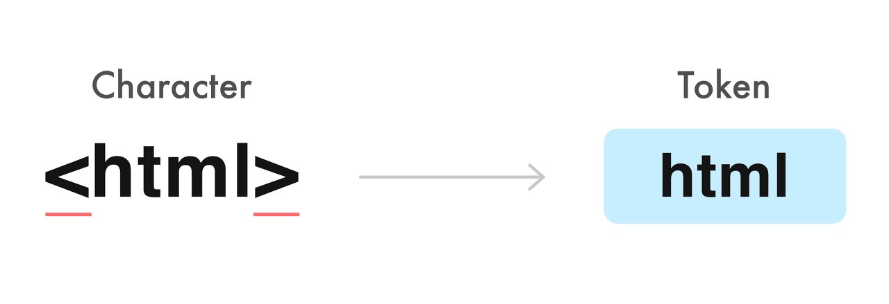 <html>을 보면 html 시작 토큰을 만들고,</html>를 보면 html 종료 토큰을 만들어 냅니다. 여기에는 태그 뿐만 아니라 속성(class등)이나, 텍스트 같은 HTML 요소가 포함돼요.