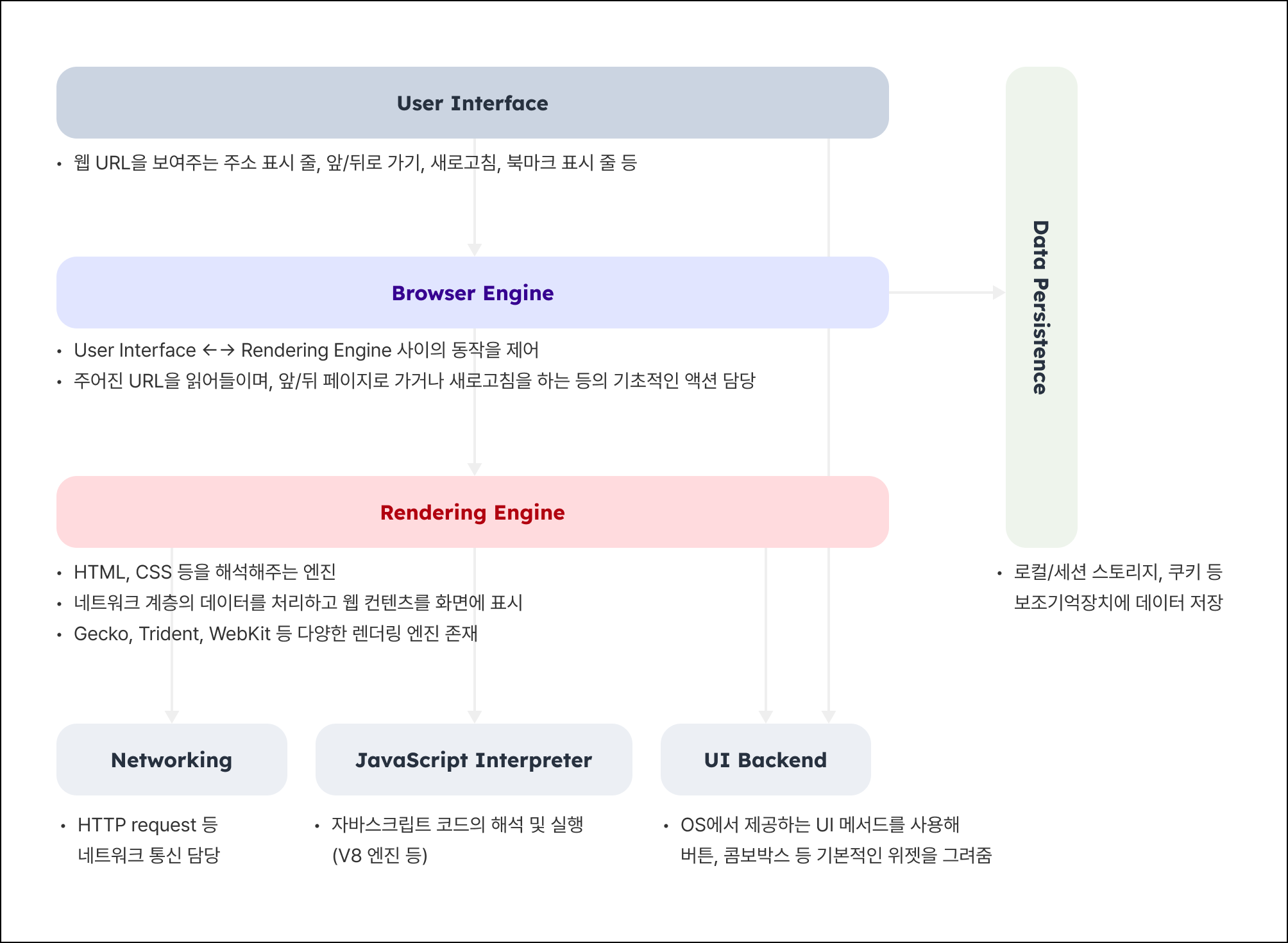 여기서 집중해서 볼 것은 바로 ‘렌더링 엔진’으로, 우리가 만든 마크업과 스타일을 해석해서 그려내는 역할을 합니다.