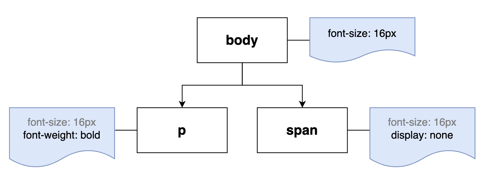 <p>는<body>의 자식이니까<body>에 적용된 스타일인font-size:16px가 적용됩니다. 그 다음에는 자기 자신의 스타일인font-weight:bold;가 추가로 적용됩니다.
