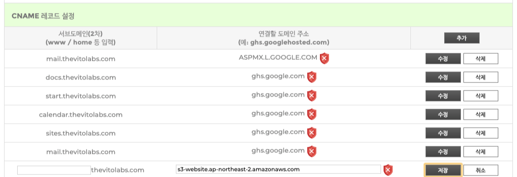 CNAME에서 도메인 이름은 도메인 주소 그대로 넣고, 연결할 도메인 주소는 엔드포인트에서 버킷이름을 제외하면 된다.