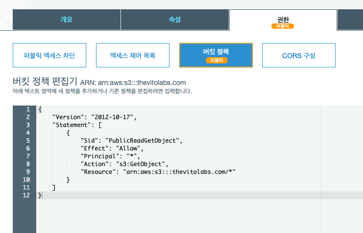 버킷 정책에 아래 내용을 붙여넣으면 버킷 자체가 퍼블릭으로 변한다.