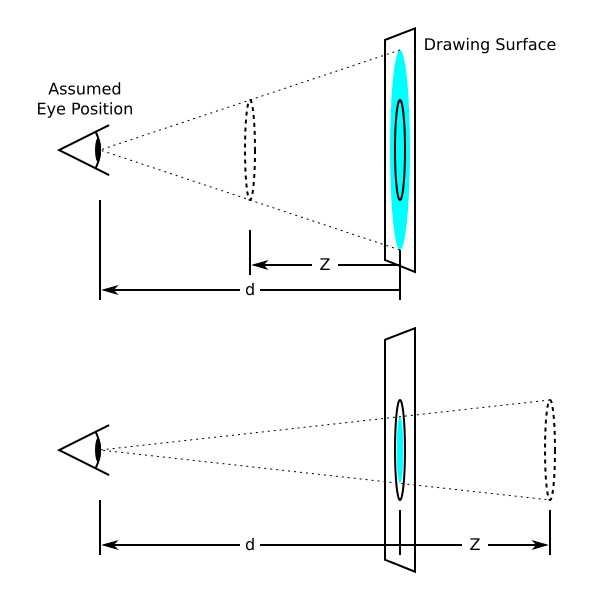 d는 보는 사람과 화면과의 거리이고(=perspective) Z는 z축상 요소의 위치를 말합니다.