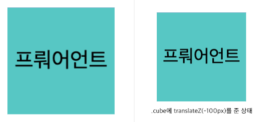 그런데 이왕 transform 쓴 거, translateZ 값으로 옮겨봅시다. 이때, 앞뒷면도 값을 주는 거 잊지 말자구요!