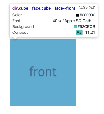 .scene { width: 200px; height: 200px; perspective: 600px; } .cube { position: relative; width: 100%; height: 100%; transform-style: preserve-3d; } .cube__face { position: absolute; width: 100%; height: 100%; }이제 앞면을 제외한 면들은 제자리로 가야겠죠? rotate 시켜줍니다.