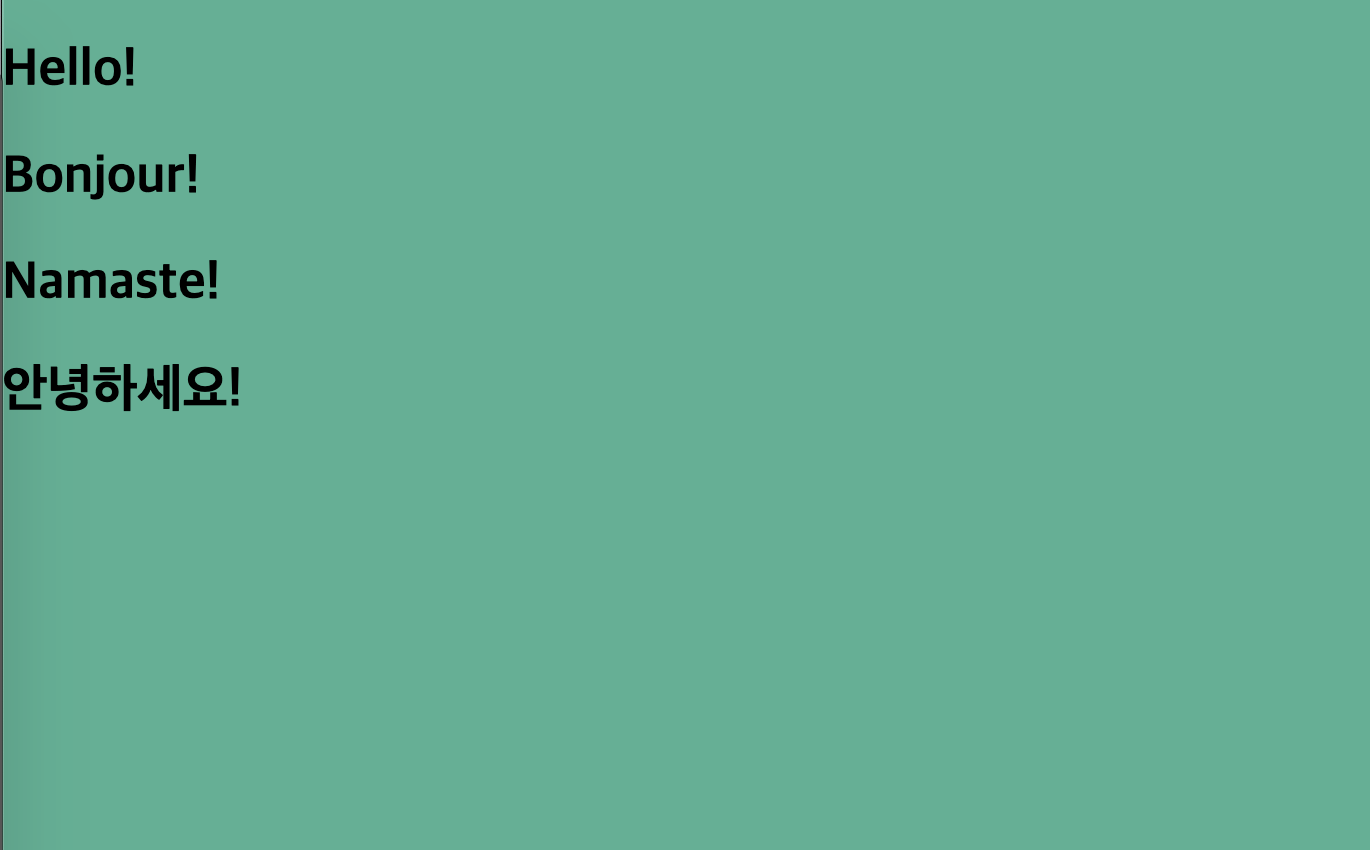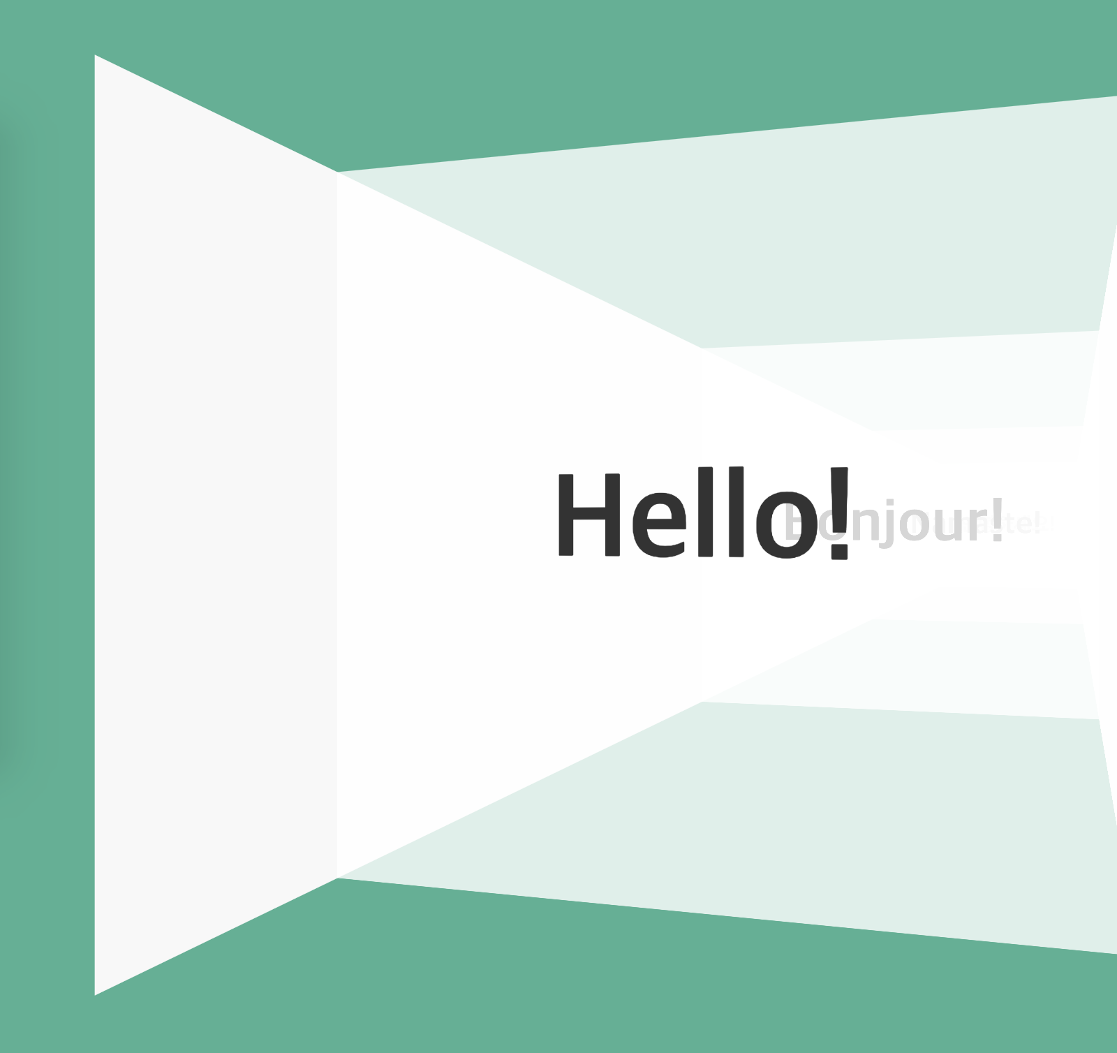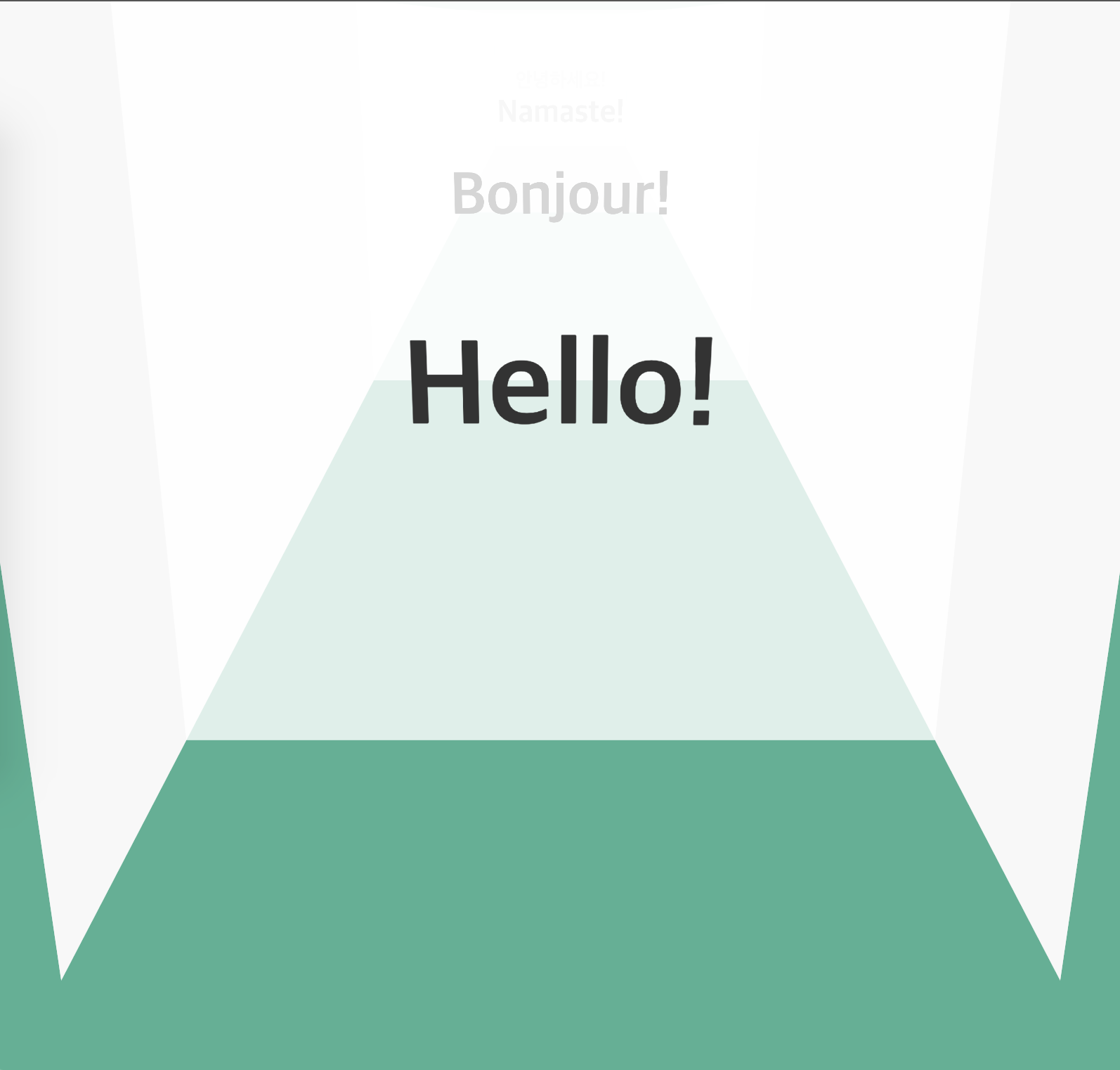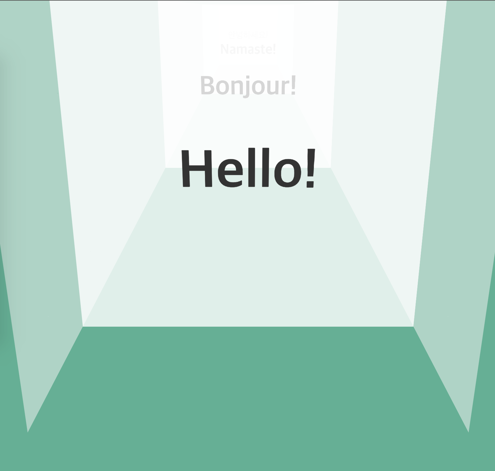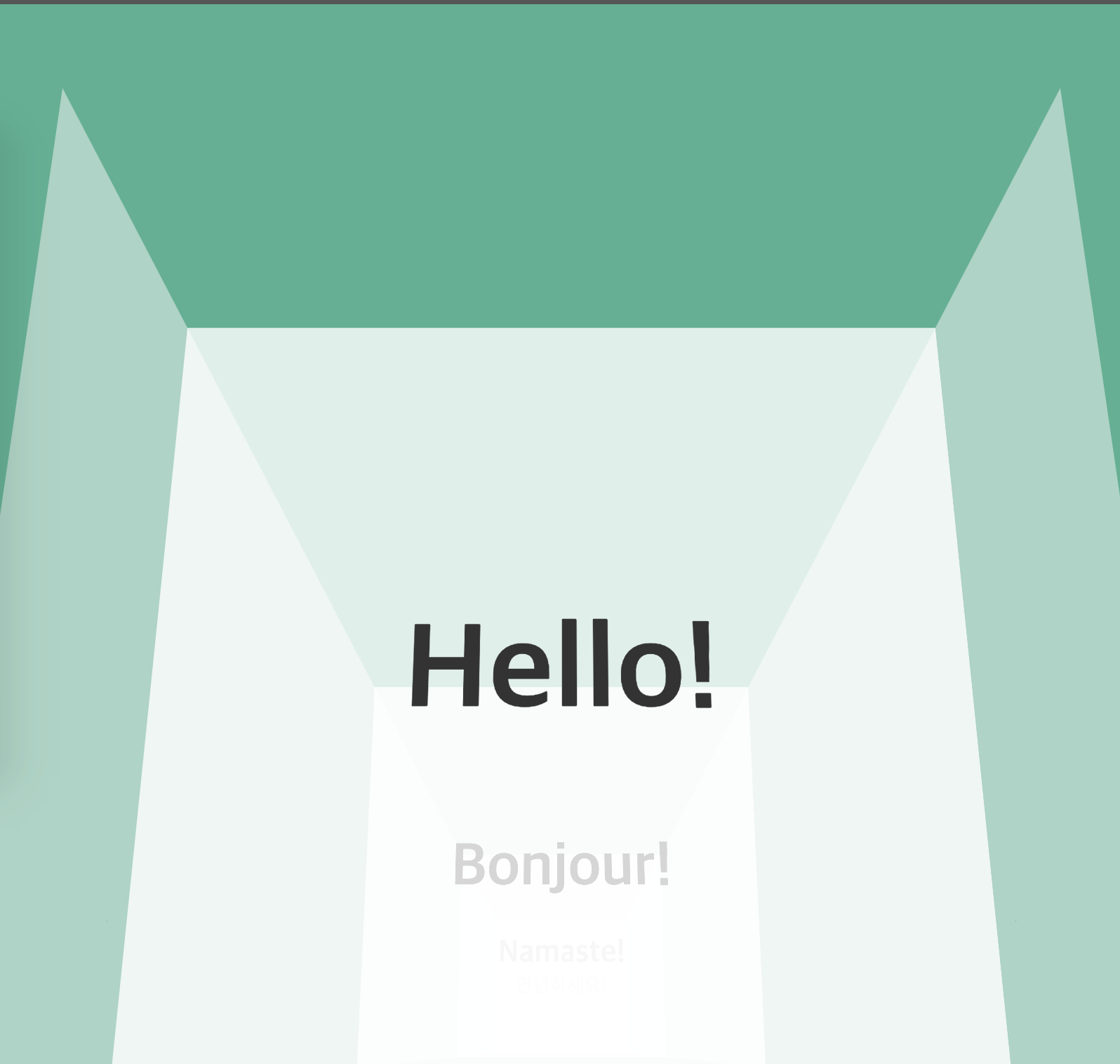 <div class="world"> <div class="stage"> <div class="house"> <div class="house__wall house__wall--left"></div> <div class="house__wall house__wall--right"></div> <div class="house__wall house__wall--front house__wall--front-a"> <div class="house__contents"> <h2 class="house__contents-title"> Hello! </h2> </div> </div> <div class="house__wall house__wall--front house__wall--front-b"> <div class="house__contents"> <h2 class="house__contents-title"> Bonjour! </h2> </div> </div> <div class="house__wall house__wall--front house__wall--front-c"> <div class="house__contents"> <h2 class="house__contents-title"> Namaste! </h2> </div> </div> <div class="house__wall house__wall--front house__wall--front-d"> <div class="house__contents"> <h2 class="house__contents-title"> 안녕하세요! </h2> </div> </div> </div> </div> </div>다음은 CSS 차례입니다.