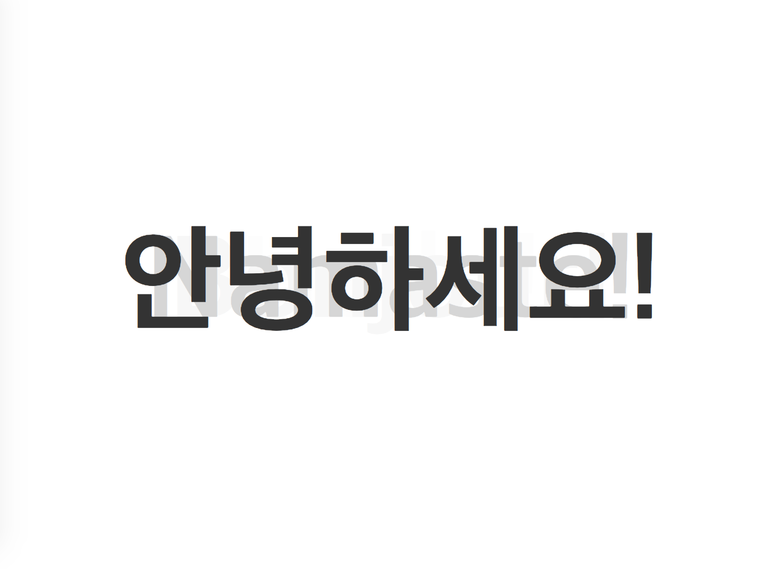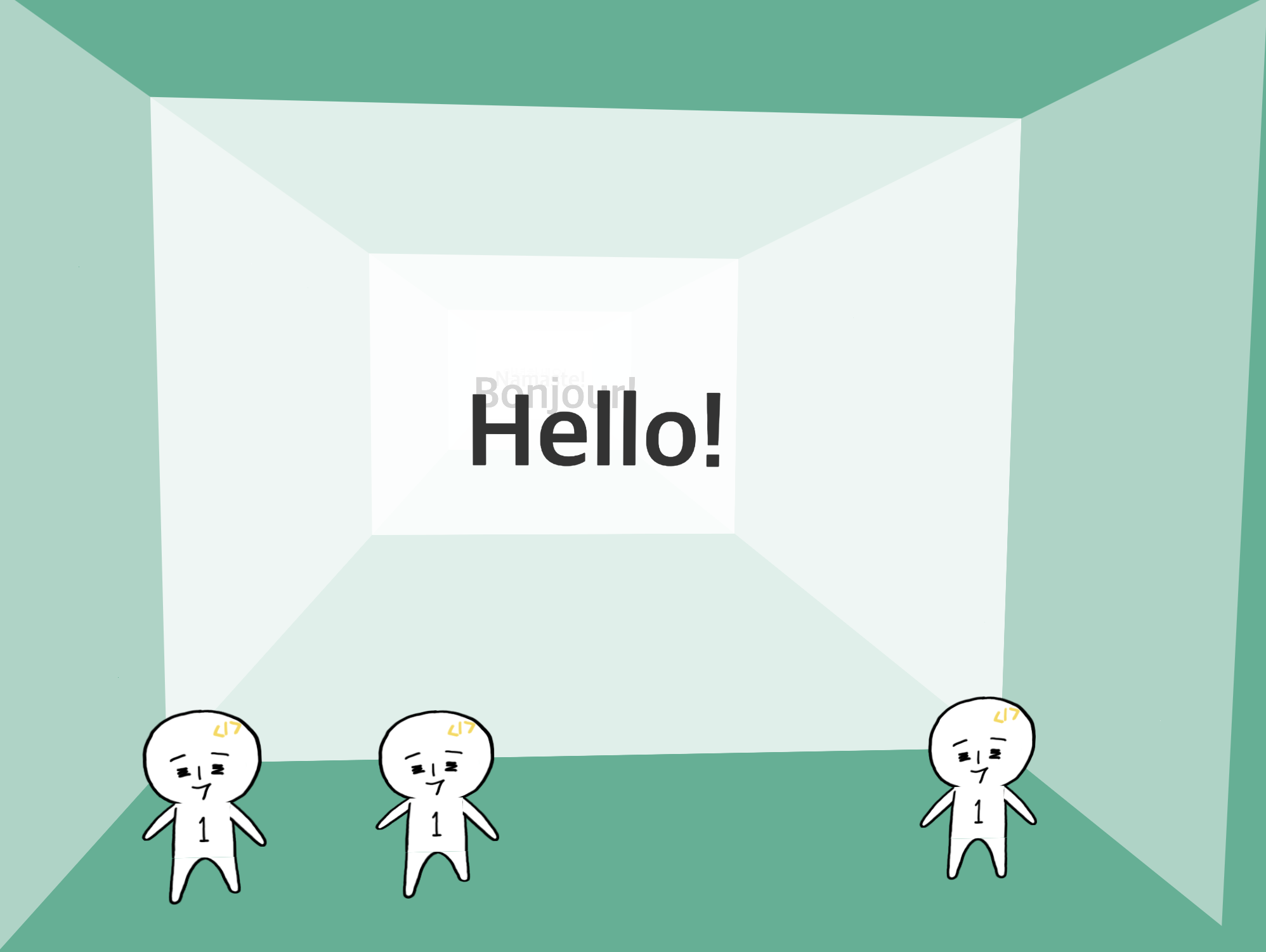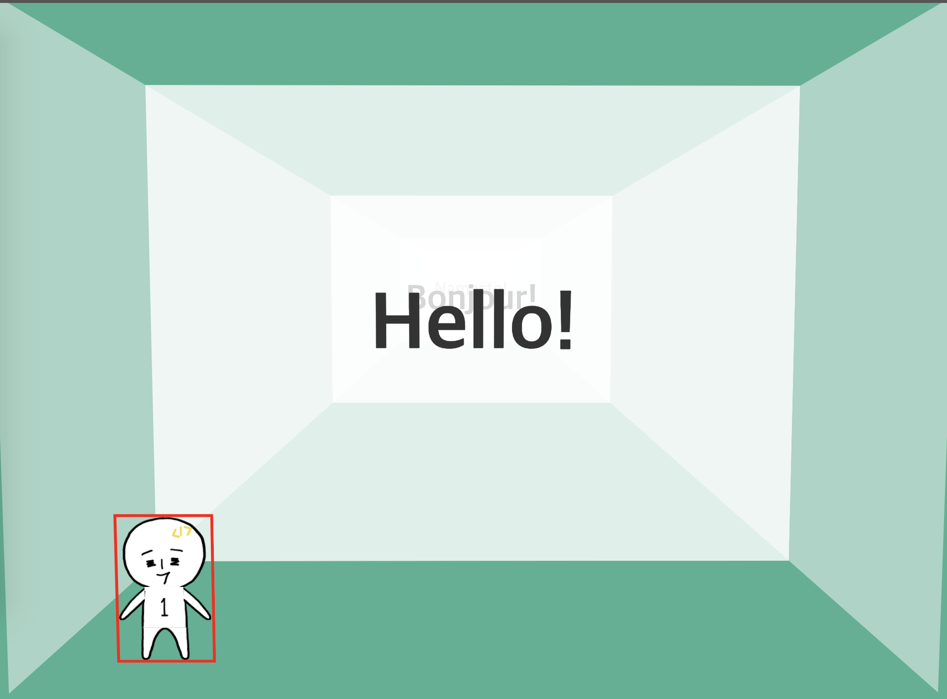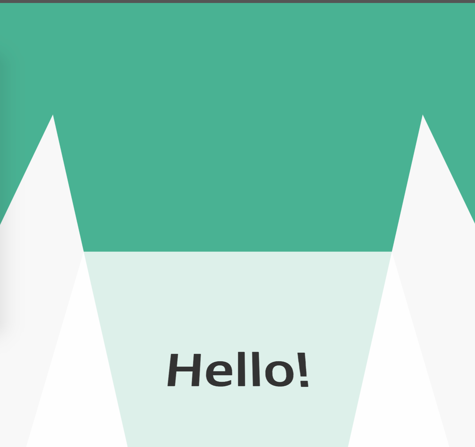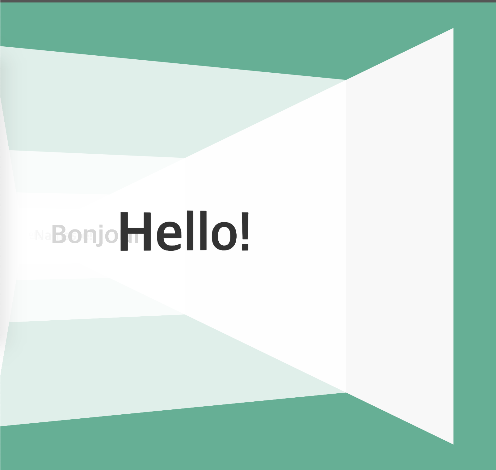 <div class="world"> <div class="stage"> <div class="house"> <div class="house__wall house__wall--left"></div> <div class="house__wall house__wall--right"></div> <div class="house__wall house__wall--front house__wall--front-a"> <div class="house__contents"> <h2 class="house__contents-title"> Hello! </h2> </div> </div> <div class="house__wall house__wall--front house__wall--front-b"> <div class="house__contents"> <h2 class="house__contents-title"> Bonjour! </h2> </div> </div> <div class="house__wall house__wall--front house__wall--front-c"> <div class="house__contents"> <h2 class="house__contents-title"> Namaste! </h2> </div> </div> <div class="house__wall house__wall--front house__wall--front-d"> <div class="house__contents"> <h2 class="house__contents-title"> 안녕하세요! </h2> </div> </div> </div> </div> </div>다음은 CSS 차례입니다.