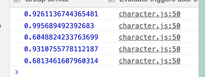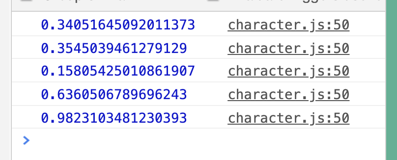 Math.random() 캐릭터를 5개 만들었더니 어떤 애는 0.1, 어떤 애는 0.9의 스피드를 갖네요.