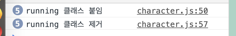 Character.prototype = { constructor: Character, init: function () { const self = this; //변수명은 self 또는 that이라고 많이들 쓴다 window.addEventListener("scroll", function () { if (!self.scrollState) { self.mainElem.classList.add("running"); this.console.log("running 클래스 붙임"); } self.scrollState = this.setTimeout(function () { self.scrollState = false; self.mainElem.classList.remove("running"); this.console.log("running 클래스 제거"); }, 500); }); } };하지만 클래스가 계속 붙었다 떼었다하는 건 여전합니다.