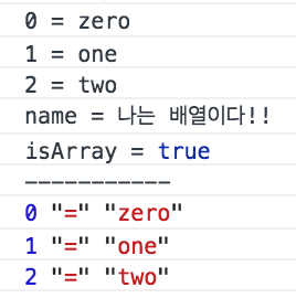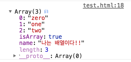 var myArr = ['zero', 'one', 'two']; myArr.name = '나는 배열이다!!'; myArr.isArray = true; console.dir(myArr);