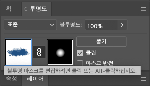 - 특정 영역 안에서만 보이게끔 마스크 처리할 때는, 투명도 탭에서 불투명도 마스크 클릭 후 원하는 모양을 넣어준다.