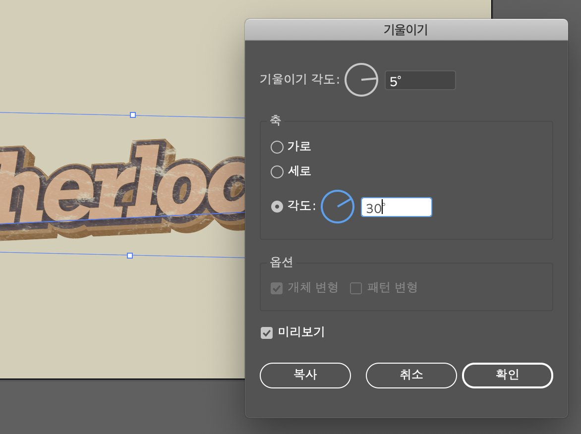- 오브젝트 - 변형 - 기울이기를 하면 도형의 축을 지정한 채 기울일 수 있다.