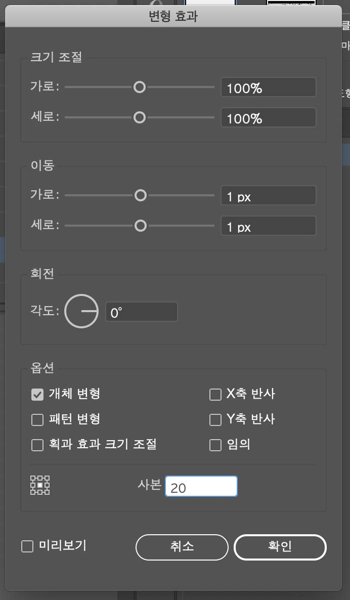 fx 버튼을 눌러 왜곡과 변형 - 변형을 선택. 가로세로 1px씩 이동시킨 뒤, 사본을 생성.