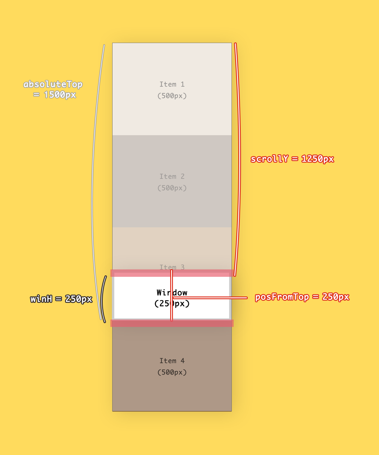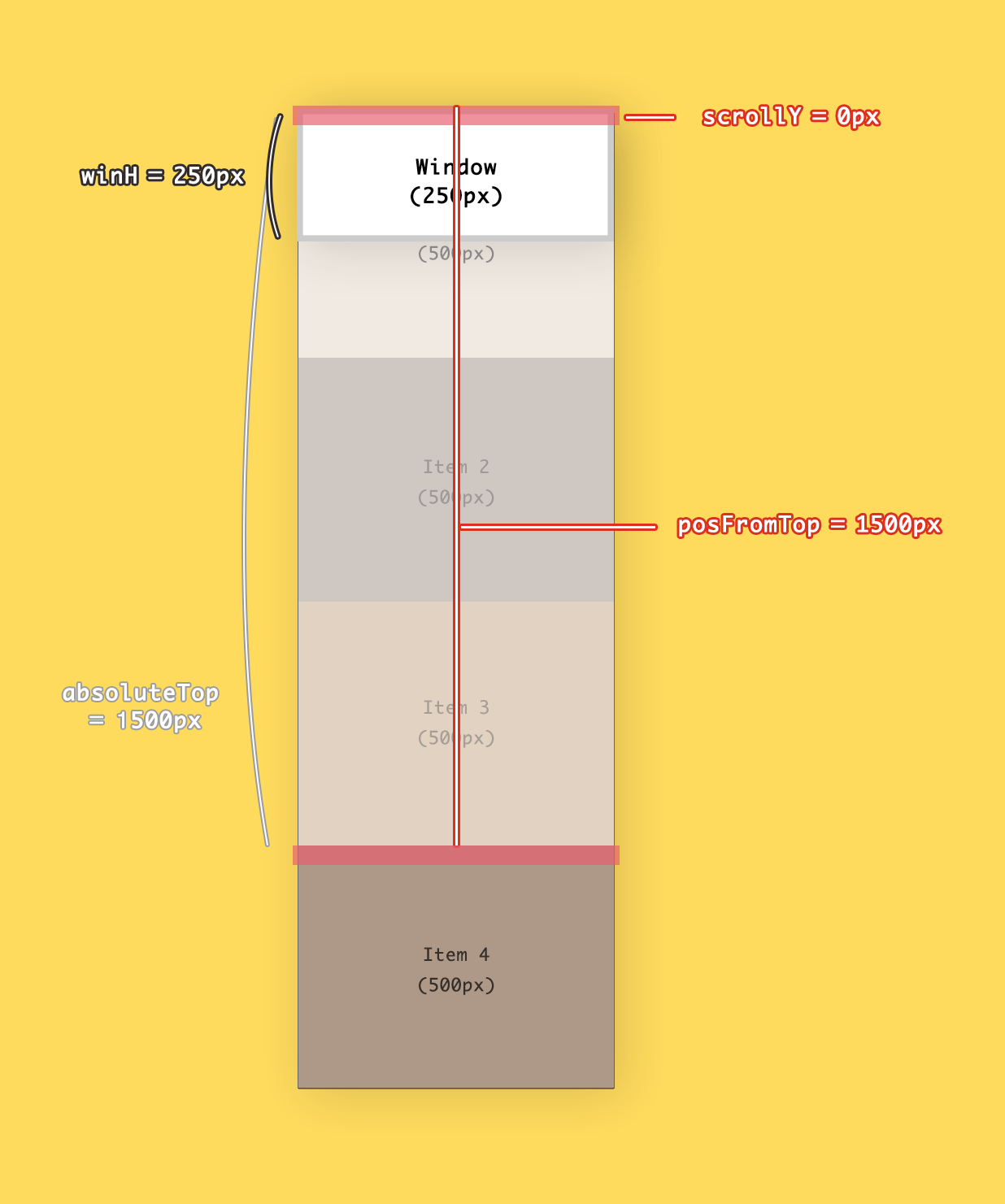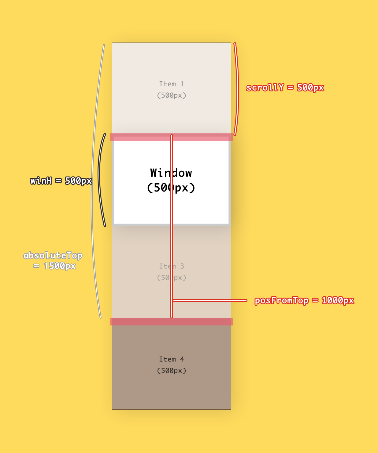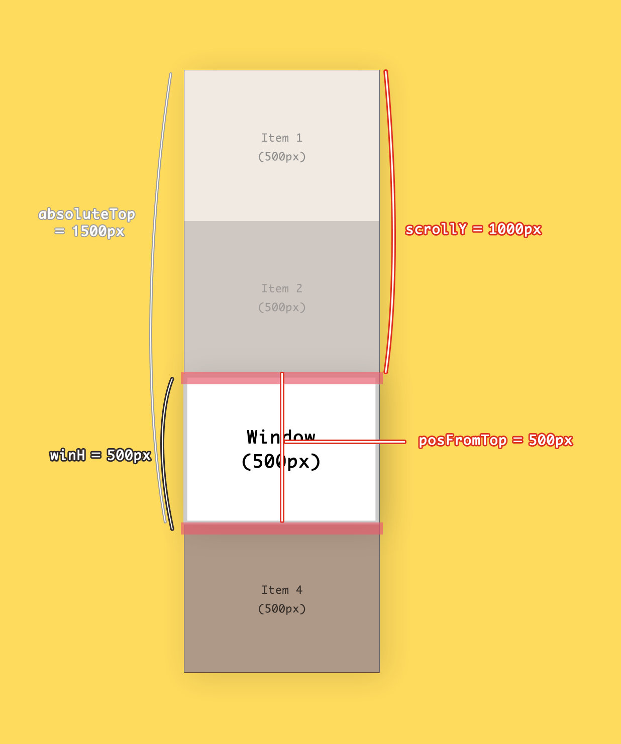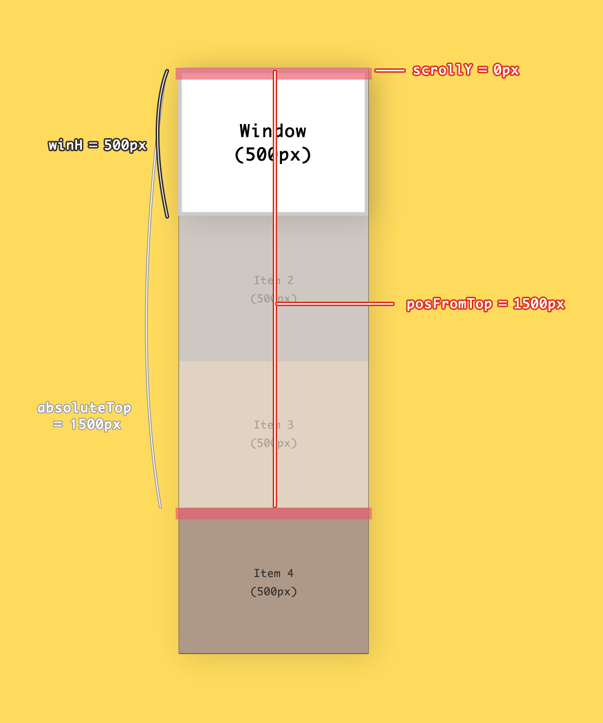 /* 윈도우의 높이 */ var winH = window.innerHeight; //500 /* 스크롤 값 */ var scrollY = window.scrollY; //0 /* item 4의 top 값 */ var posFromTop = item4.getBoundingClientRect().top; //1500 /* item 4의 절대좌표 값 */ var absolutePos = scrollY + posFromTop; //1500이렇게 총 4개네요! 하나하나 살펴봅시다.