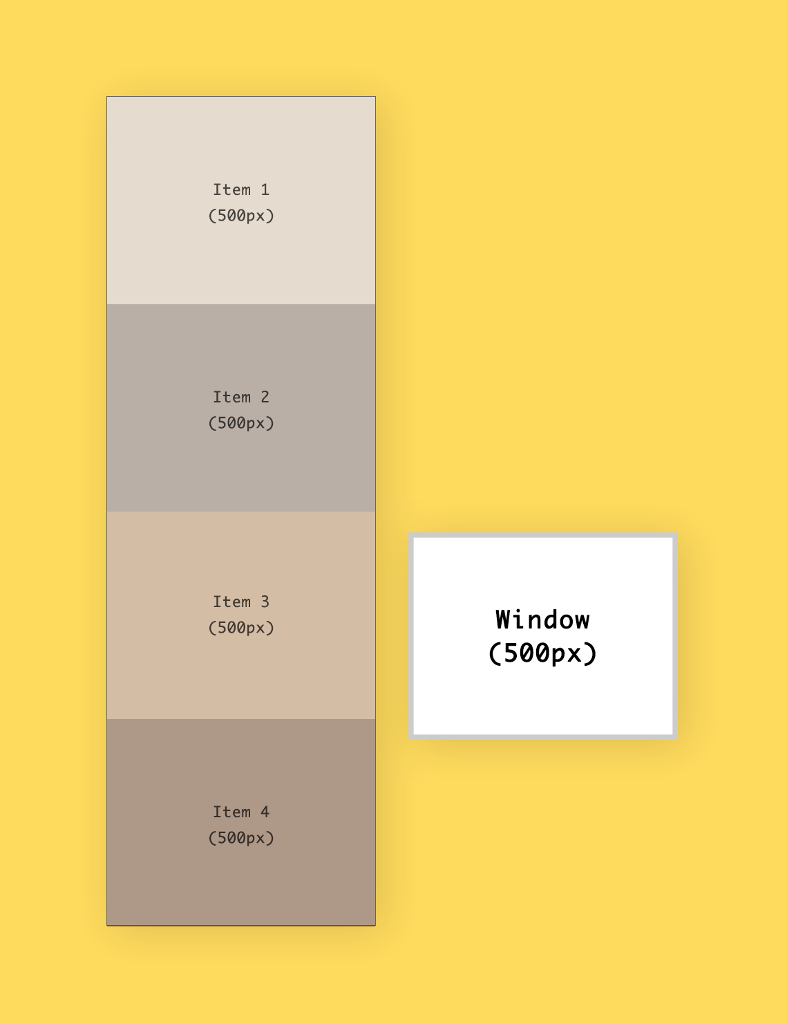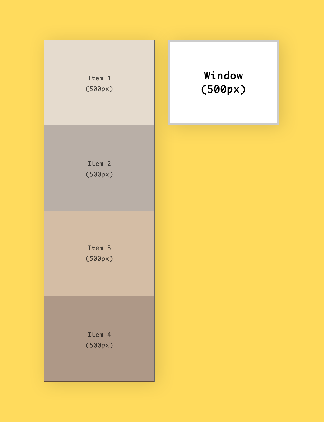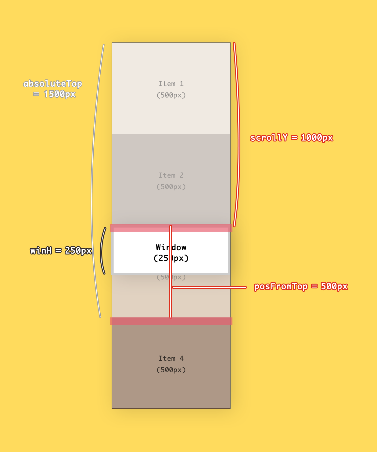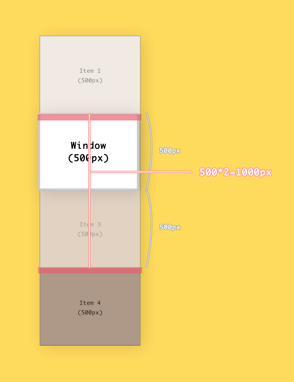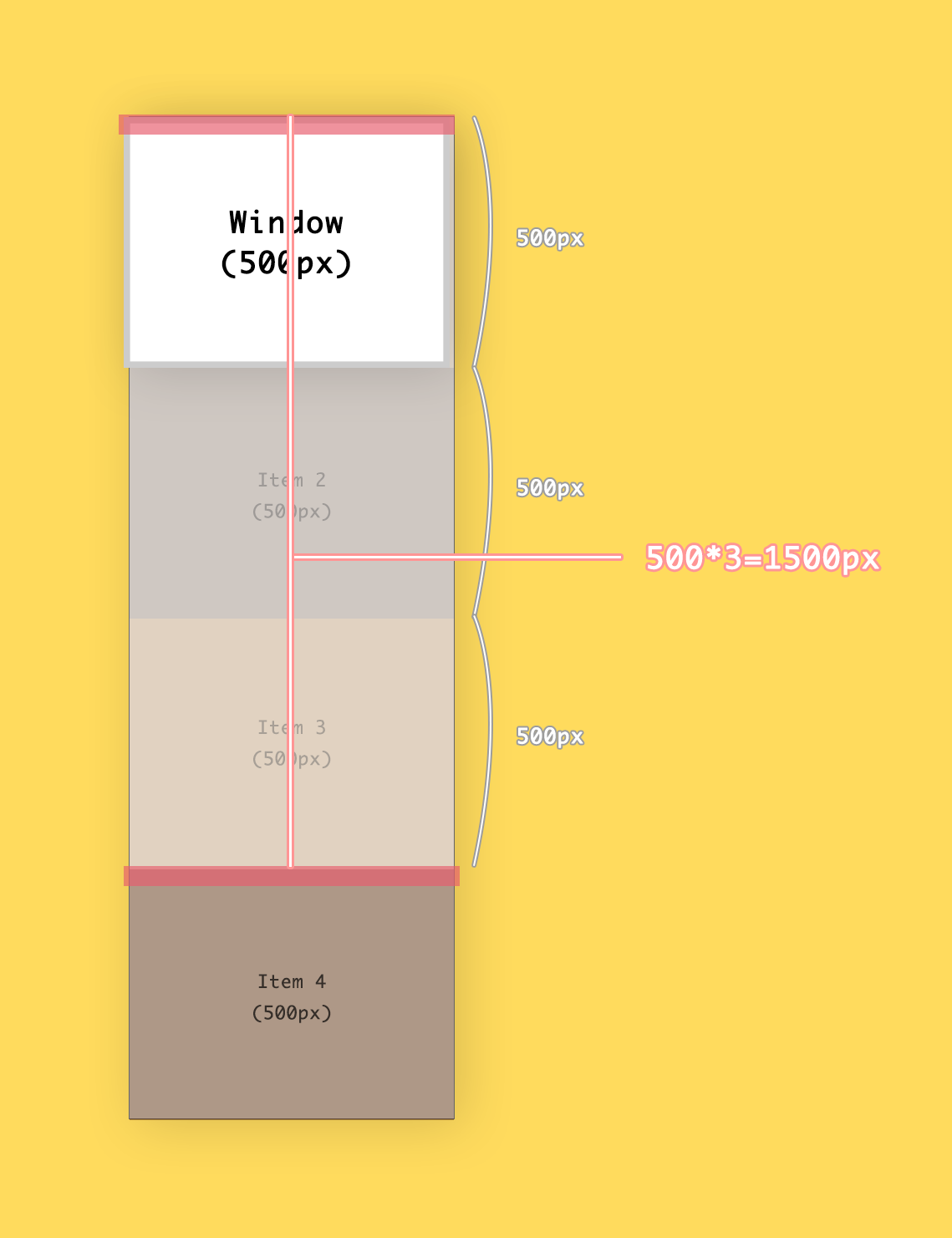 윈도우의 최상단과 item4의 최상단간의 거리를 확인해 보세요. item4 위로 아이템이 총 3개 있었죠. 따라서 500*3 = 1500만큼의 거리가 있는 셈입니다. 잊지 마세요, 최하단이 아니라 최상단입니다!