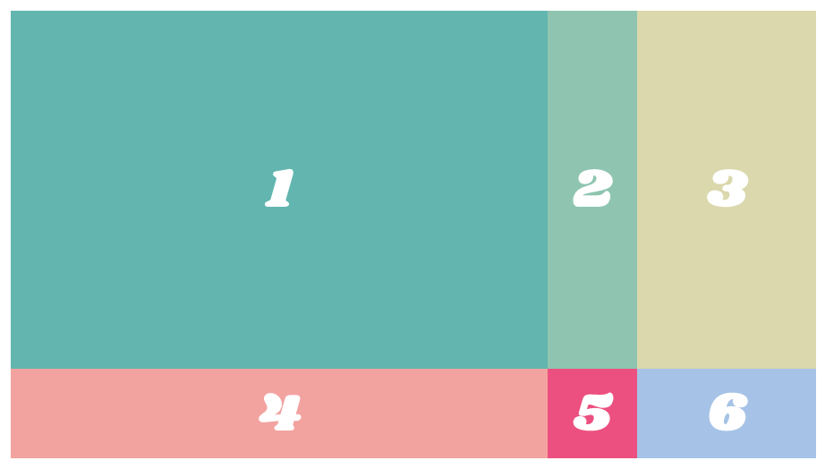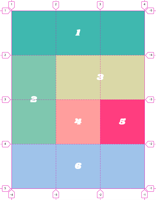 .item1 { grid-column: 1 / 4; } .item2 { grid-row: 2 / 4; } .item3 { grid-column : 2 / span 2; } .item6 { grid-column : 1 / span 3; }