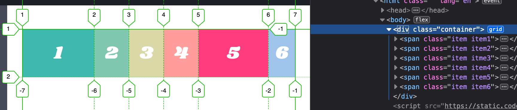 .container { display: grid; grid-template-columns: repeat(3, 1fr); } .item4 { grid-column-end: span 2; } .item6 { grid-column-end: span 3; }
