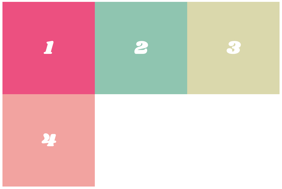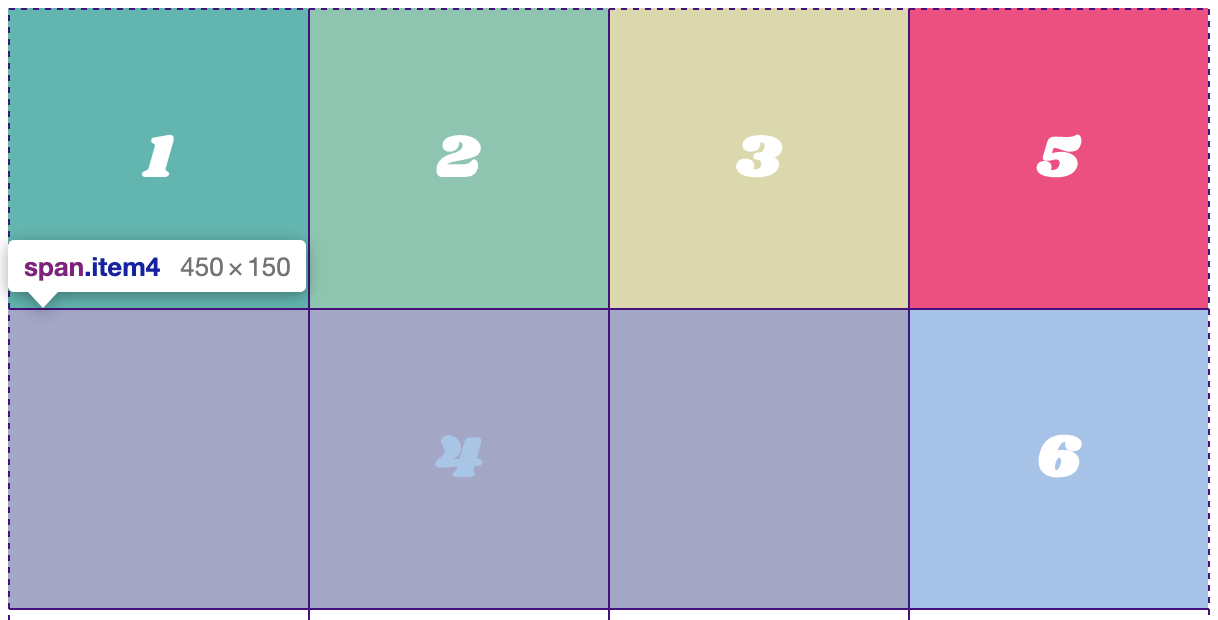 .container { display: grid; grid-template-columns: repeat(4, 1fr); grid-template-rows: repeat(2, 100px); } .item4 { grid-row-start: 2; grid-column-end: span 3; }