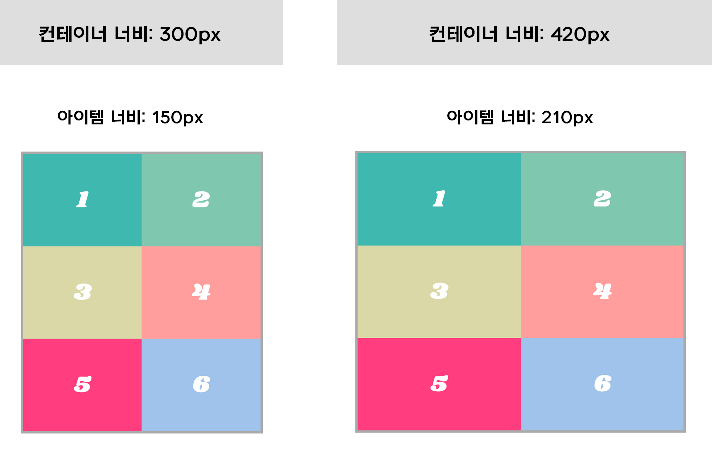 이 상태에서 컨테이너 너비가 늘어나면 아이템 너비도 그에 맞춰 옆으로 쭈우욱 늘어납니다.
