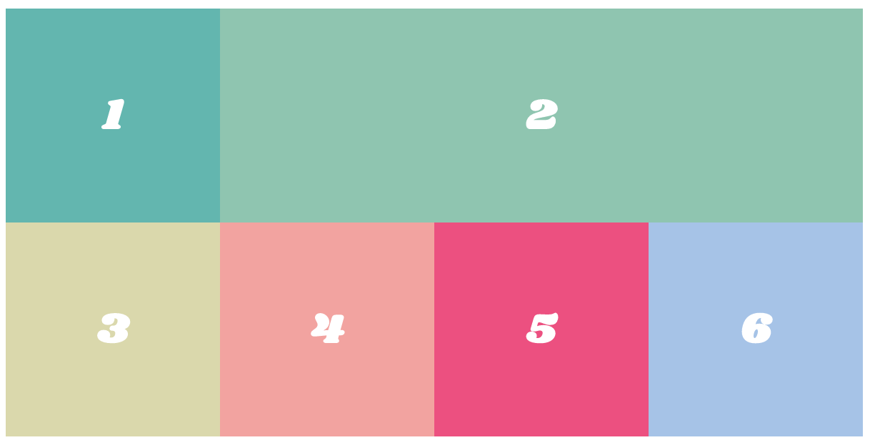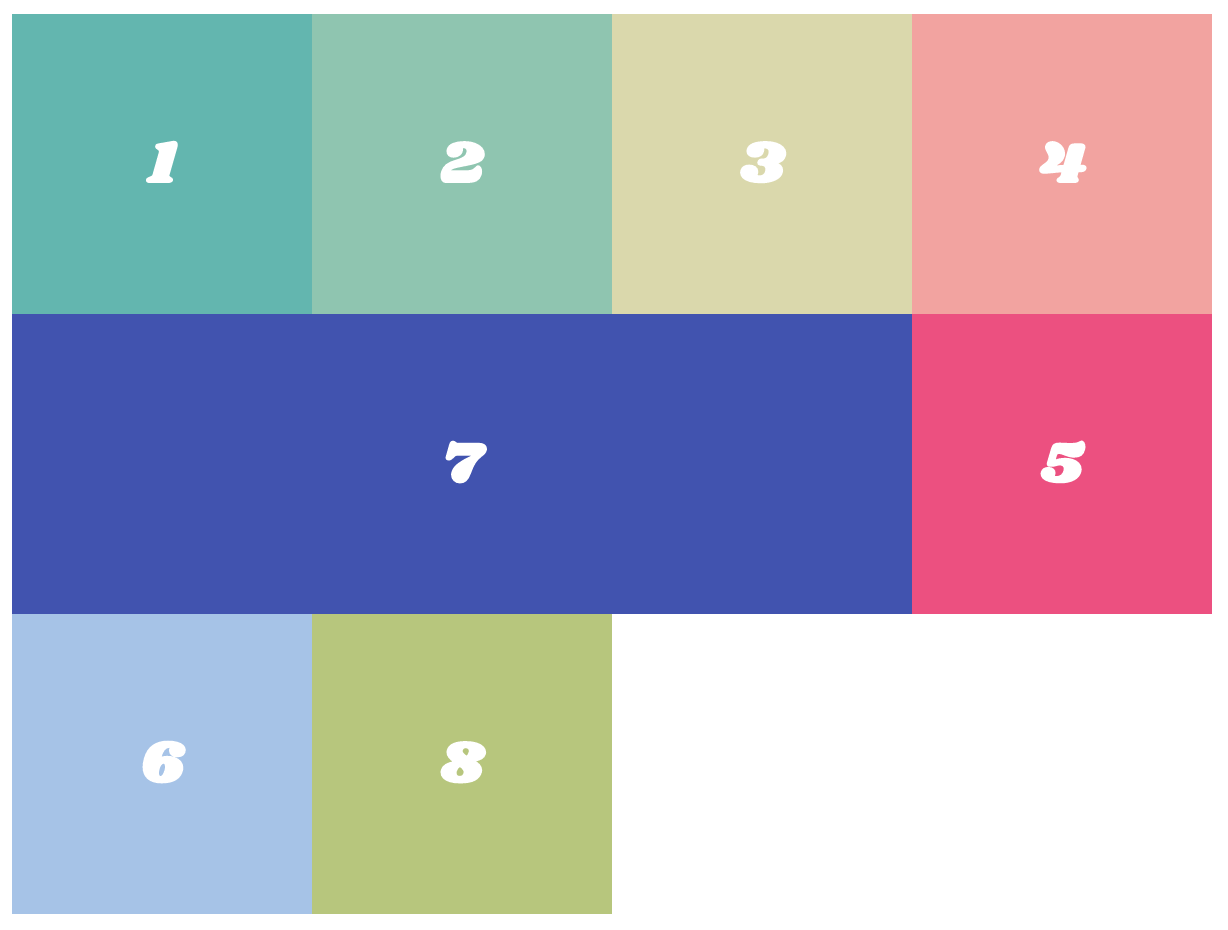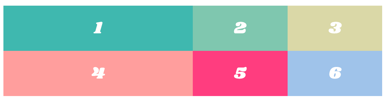 .container { display: grid; grid-template-columns: repeat(3, 1fr); } .item4 { grid-column-end: span 2; } .item6 { grid-column-end: span 3; }