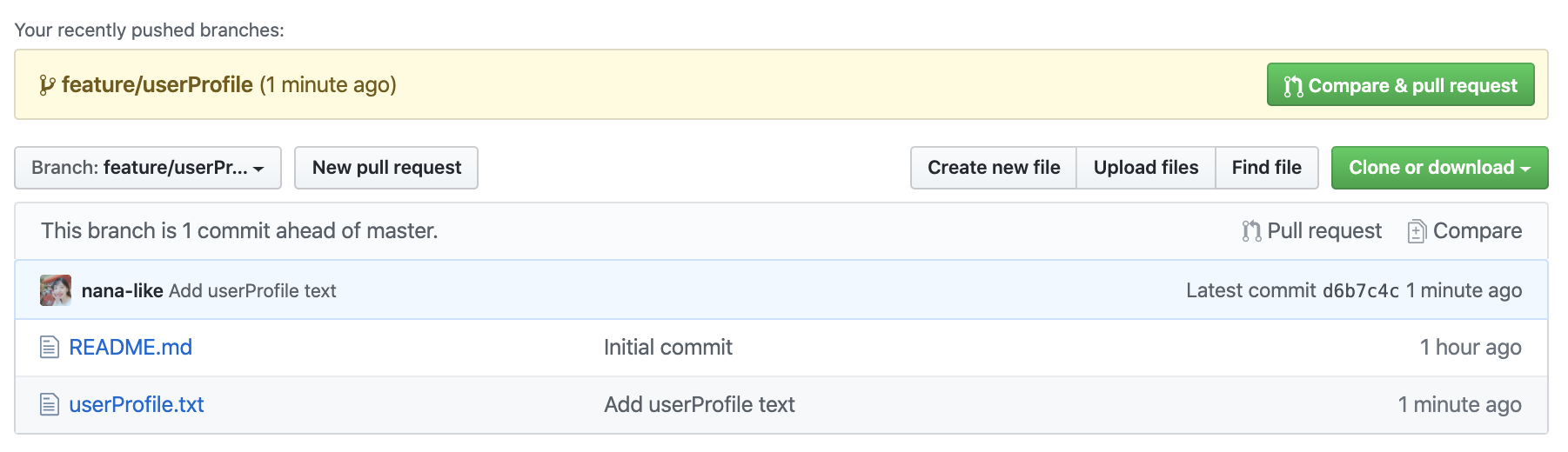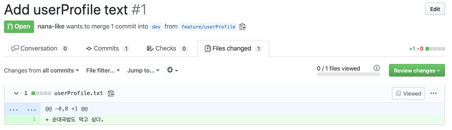 nana-like가 feature/userProfile에서 1커밋을 했고 그걸 dev에 합치고 싶어한대요~!! 라고 잘 알려주네요.